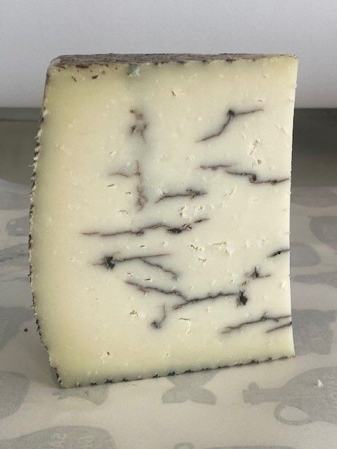 The cheeses are made in distinctive woven baskets and then matured on wooden shelves, turning weekly. At the 4 week mark the cheeses are spiked with Italian black truffle paste and matured for an additional 4-6 weeks. The result is a firm pressed cheese, slightly salty with umami from the truffle.