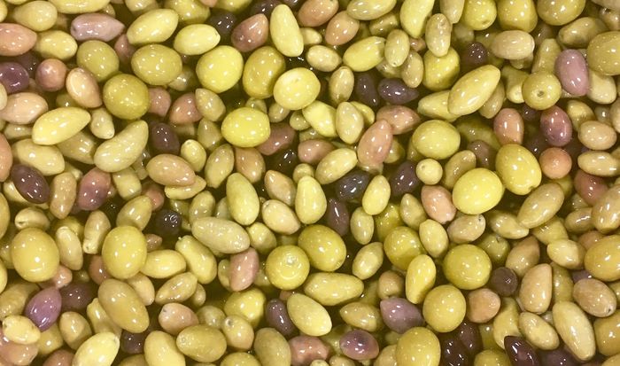Four different olives: Wallace, Kalamata, Tuscan, Verdale (but sometimes can contain Sevillano, Blonde or Early pick Kalamata). The Tuscan olive gives a juicy round fruit, the Verdale is small and bright green with a fresh taste.